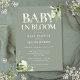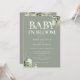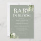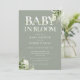 Convite de baby shower bebê em flor apresentando uma elegante e bonita tipografia botânica de folhagem verde em um fundo verde sage neutro em termos de gênero. Criado por Thisisnotme