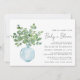 Este brilhante e alegre convite para chás de fraldas neutro em termos de gênero apresenta uma ilustração em aquarela do eucalipto verde sábio em um vaso de vidro azul e "Baby in Bloom" escrito em um roteiro de na moda. Adicione o nome da futura mãe e os detalhes do chá em uma simples tipografia moderna.