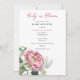 Um belo design de convite para chás de fraldas de aquarelas com floral rosa pincelado. Uma peônia rosa e verde. Um design ideal para quem adora ilustrações botânicas coloridas, florais de aquarela, ilustrações cor-de-rosa e arte temática floral. Convite perfeito para chás de bebês rosa sazonal.
