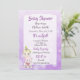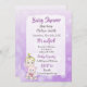 Convites de Chuvinha de Bebê de Bebê Loira Menina com Urso de Pelúcia com bolinhas e laços roxos e brancos.