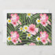 Este convite de chá de bebê tropical impressionante apresenta um charmoso flamingo rosa cercado por flores de hibisco exuberantes, plumeria e folhas de palmeira em tons vibrantes de rosa quente, amarelo e branco. O texto "Aloha, Bebê Menina" em letra cursiva negrito define um tom havaiano festivo, com destaques em rosa coral realçando o nome da homenageada. Um padrão floral tropical dramático em um fundo escuro adorna o verso do cartão. Todas as palavras são totalmente personalizáveis para sua celebração.
