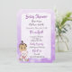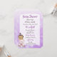 Convites de chá de bebê de Bebê Menina Hispânica ou Afro-Americana com Urso de Pelúcia com fundo roxo.