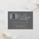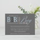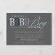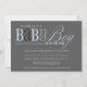 Convite de Chá de fraldas com as palavras "bebê rapaz" em azul, cinza e preto, com os detalhes da festa abaixo.