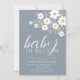 Você está planejando um chá de fraldas de menina? Este belo convite é decorado com margaridas desenhadas à mão num fundo azul. Diz "Baby in Bloom" na tipografia da na moda. Facilmente personalizável. Desenho original © Michele Davies.