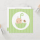 Convites de chuveiro de bebê na moda com ilustração de um bebê fofo e um pássaro em um guarda-chuva em um fundo de listras. Art © Cocoa Studio