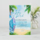 Um convite para o chá de fraldas de bebê que você pode personalizar como chá de casal ou apenas para a mãe ser. Design apresenta cena de praia aquarela com oceano, palmeiras e pranchas de surfe e legal inscrição manuscrita. Design neutro em gênero para um chá de fraldas de menino ou chá de fraldas de menina e perfeito para o tema de surfe no verão, tema de praia, tema oceânico, sob a festa do mar ou da piscina.