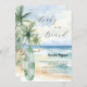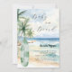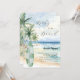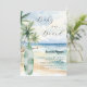 Um convite elegante para um Chá de fraldas. Uma praia arenosa de cor aquática, ondas oceânicas e palmeiras como fundo, e uma prancha verde neutra em termos de gênero na praia.