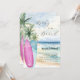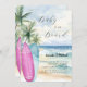 Um convite elegante para um Partido da Revenda de Gênero. Uma praia arenosa de cor aquática, ondas oceânicas e palmeiras como fundo, e uma prancha de surfe azul e rosa na praia. Para um gênero revelador ou esperado gêmeos.