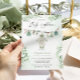 Este convite captura perfeitamente a essência da música 'boho' com uma reviravolta branca para bebês, combinando tons verdes sábios, trabalho de arte de aquarelas moles e detalhes boho para criar um convite sereno e na moda para um chá de fraldas memorável. Itens correspondentes disponíveis.