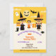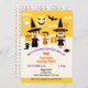 Comemore o segundo aniversário do seu filho com este convite geométrico e moderno, apresentando o aniversariante com sua mãe e seu pai celebrando na noite de Halloween. O bolo de aniversário está pronto. Mãe e pai estão todos vestidos, e é o menino! Um presente está à espera de ser aberto e um bolo de aniversário está pronto para ser comido! Fantasmas, morcegos, gatos e aranhas se juntaram à festa. O fundo deste convite para a festa de aniversário do Dia das Bruxas apresenta pontos coloridos que parecem confete festivo e um sol brilhante sorridente. É tão fácil personalizar este simples e fofo convite de festas de aniversário com seus próprios detalhes.