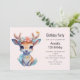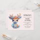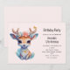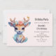 Um convite de aniversário com uma ilustração adorável. Um bebê veado doce com olhos grandes, chifres e um pequeno amigo borboleta. Design encantador.