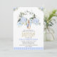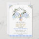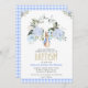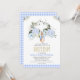 Bebê Xadrez Floral Peter Rabbit Baptism Convite à apresentação de coelhinhos doces para um menino com ilustração de Peter Rabbit fofa, vários arranjos florais azuis para bebês, padrão de xadrez azul, pontos brilhantes de ouro e rumo. Esta design é ideal para alguém que procura o convite batizante de Peter Rabbit, um menino pequeno.