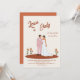 Antiguamente convite de casamento elegante sobre o fundo bege, com noiva graciosa e noiva cercado por flores laranja vibrantes, evocando calor e romance.