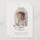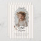 Celebrate your little one's Goose themed first Birthday with this easy to edit template. Featuring a playful wavy bow border with your own custom photo inside. There is a sweet little goose with a black bow on it in the corner, along with 'One silly goose' typography, along with a beige stripy background.