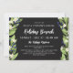 Belo convite para o almoço de férias florais com verde de sábio, flores brancas e bagas azuis a enquadrar o seu texto de convite.