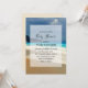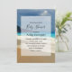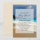 Convite de chá de bebê com uma bela fotografia com um mar azul turquesa e uma praia arenosa com montanhas ao fundo.