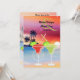 O belo design do convite de casamento apresenta uma cena de praia encantadora com um pôr do sol vibrante sobre o oceano. Há duas Margaritas com canudos cruzados na frente do fundo que inclui silhuetas charmosas de palmeiras. Fácilmente personalizável com todas as informações do seu casamento.