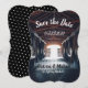 Lindos cartões Save the Date de uma bela ponte coberta da Nova Inglaterra, únicos. Perfeitos para um casamento rústico em celeiro, fazenda ou ao ar livre. Apresentam frente completamente personalizável e adorável fundo preto com bolinhas brancas.
