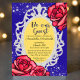 Este elegante convite de festas personalizado apresenta um tema Beleza e conto de fadas da Besta sobre um fundo de cor azul. A frase clássica Beleza e conto de fadas da Besta, "Seja nosso Convidado" é impressa acima da informação do evento, dentro a um espelho reluzente prateado com fundo amarelo. Duas rosas vermelhas de vidro colorido aparecem no canto inferior esquerdo, com um rosa solteiro no canto superior direito. Os diamantes de brilho destacam as porções superior e inferior.