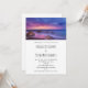 Um convite para o casamento com uma bela fotografia com cores marcantes de roxo, azul e rosa ao pôr do sol. Uma bonito linha costeira espalhada por rochas.