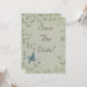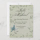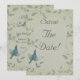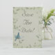 Bela pintura de um pássaro azul voando para cima colocada em um fundo manchado de verde cinza suave com videiras elegantes e frondosas. Destaque-se da multidão com este belo e elegante cartão de salva data de casamento único. O design recebe uma textura de tecido falso para dar efeito. Este design de cartão de salva data de casamento também vem em muitos outros produtos de papelaria para atender a todas as necessidades do seu conjunto de casamento.