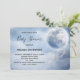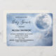 Chá de fraldas convite com um céu azul sangrento com nuvens e uma lua grande e bonita. 2 cisnes brancas voando juntas.