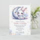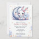 Um belo convite de aniversário com um belo coelhinho branco vestindo um belo arco rosa sentado diante da adorável lua com estrelas douradas caindo.