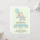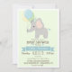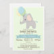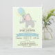 Elefante bebê bonito com balões azuis, verdes e amarelos pastéis; convite para chás de fraldas de menino. Personalize este convite bonito e retrô; pode ser para chá de fraldas ou pode ser trocado para o bebê borrifado. Bela, simples, design simples. Apresenta elefante, robins com fita azul de ovo e corações, fonte marrom e fundo branco fora. Excelente para animais da selva, animais do zoológico ou chá de fraldas temático safari ou borrão!
