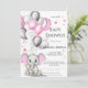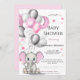 Uma bela arte de chá de fraldas com um elefante de menina com orelhas cor-de-rosa segurando balões em cores rosa, branca e prata. Design chá de fraldas Adorável com estrelas cor-de-rosa e creme à volta. Personalize alterando o texto e os detalhes.