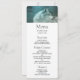 Cardápio de casamento com uma fotografia de um lobo cinza peludo e fofo. Ao fundo, uma floresta escura com árvores. Atmosfera mágica e mística.