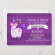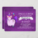 Convite de aniversário com um desenho caprichoso com um unicórnio cor-de-rosa que tem um homem roxo e um conto. Esta criatura fofa está vestindo óculos de sol em forma de coração e tem pequenas estrelas e um coração em seu corpo. Um fundo de listras roxas.