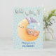 Aqui está um adorável convite para chás de fraldas que mostra um urso marrom em um boné azul dormindo em uma lua amarela sorridente. A lua veste uma lavanda e um boné branco. Texto em padrões azuis tipo biscoito estilizados diz "OH BABY" no topo, e texto azul mais escuro no final diz "Por favor, junte-se a nós para CELEBRAR!" A imagem e o texto são colocados sobre um sutil fundo azul estrelado. A parte de trás do convite tem bastante espaço para o seu próprio texto personalizado, e repete o fundo de estrelas azuis, com uma imagem adicionada de uma nuvem com anexos de constelação. Bonita!
