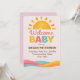 Um convite de chá de bebê alegre e brilhante com um sol sorridente, nuvens pastéis suaves e um fundo inspirado no céu. Os tons amarelos quentes e o estilo aquarela divertido criam uma atmosfera feliz e convidativa, perfeita para celebrar um pequeno a caminho. Projetado para chás de bebê com tema de sol com um sentimento doce e edificante.