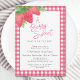 This cute baby shower invitation features watercolor strawberries and leaves on a plaid gingham background.