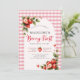 A berry sweet strawberry arch summer 1st birthday invitation featuring a charming pink gingham pattern and an arch frame with watercolor strawberries and leafy vines for your party details. On the back, the same charming frame serves as a photo frame for a picture of your adorable little strawberry. The design blends sweet farmhouse charm with fresh summer style, perfect for a girl’s first birthday, strawberry theme party, or berry patch celebration.
