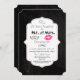 Um convite de aniversário de casamento com uma design de tendências - lábios de kissy cor-de-rosa glamourosos e uma ilustração de bigode retrô-olado masculino. Com as palavras Sr. e Sra. Set sobre um fundo negro de quadro negro. Um quadro decorativo de rico com uma borda de gradiente dourado colocada sobre cima com o dentro de informações de sua parte. Personalize com os detalhes da sua festa de aniversário.