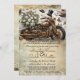 This invitation features a gold motorcycle with steampunk elements, white roses, doves, and angel wings. All text is editable to customize to your own wording.