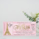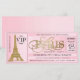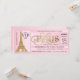 Convite de aniversário Paris com a bela Torre Eiffel e texto Paris em um estilo de passagem de embarque. Este convite de ingresso para Paris em rosa e dourado é facilmente personalizado para o seu evento, basta adicionar os seus detalhes.