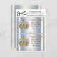 O príncipe fralda jorrada com a coroa azul-bebê e dourada em um fundo azul-bebê e dourado na frente e os pontos azuis-bebê e dourados na parte de trás. Estas passagens bonitinhas de fralda príncipe vêm impressas duas por folha. Basta cortar e colocá-los no envelope com seus convites.