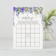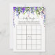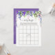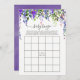 Cartão de jogo de bingo de bebê floral com rosas e peônias Violeta Ultra com acentos de roxo, rosa e azul.