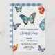 Birthday invitation featuring colorful butterflies with sparkling effects, set against a white background. Text invites guests to a 5th birthday party.