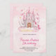 Birthday invitation with a pink castle, surrounded by birds and a unicorn, set on a soft pink background. Text invites to "Princess Arletta’s 8th birthday."