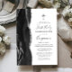 A borda esquerda deste elegante e moderno convite da primeira comunhão apresenta uma aquarela preta com brilho de prata sujo. Uma cruz de folha prateada falsa aparece acima do texto personalizável, que combina escrita manual, chapa e fontes itálicas em cinzas de carvão em um fundo branco. O verso apresenta um design de agata preto e prateado correspondente.