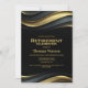 This modern black and gold retirement party invitation is the perfect way to invite your cherished friends, esteemed co-workers, and loved ones to join you in celebrating your transition into a life of leisure. The user-friendly text templates allow you to effortlessly include all the important details. This invitation will set the tone for an evening of reminiscing, laughter, and heartfelt well-wishes. A variety of paper types and corner styles are available for your unique invitations, along with the option to download if you prefer a digital format.