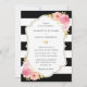 Elegant black and white floral wedding invitations featuring pink roses and gilded greenery on a black and white striped background. Matching items available.