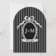 These anniversary party invitations have a black bow scalloped frame on a striped background. You can personalize with monogram letters, name and date.