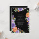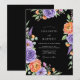 This design showcases a striking black backdrop that beautifully contrasts with vibrant watercolor blooms. Rich purple roses and soft orange blossoms are accented by sprigs of lavender and lush sage green foliage. The aesthetic evokes a moody yet sophisticated atmosphere, perfect for a bold evening or autumnal event.