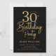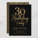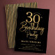 Black and gold 30th birthday party invitation. Trendy modern design, perfect for a stylish men's or women's bday celebration. Features script font and stylish stripes on the back. Customize with your own details. Printed Zazzle invitations or instant download digital printable template.