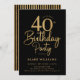 Black gold 40th birthday party invitation. Trendy modern design, perfect for a stylish men's or women's bday celebration. Features script font and stripes on the back. Customize with your own details. Printed Zazzle invitations or instant download digital printable template.