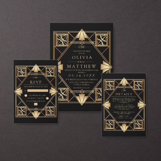 Convite Black & Gold Modern Art Deco Wedding Invitation